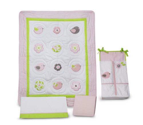 Everything you need to outfit baby's crib for sound sleeping, sweet dreams and lots of chirping friends. product benefits Set includes 1 fitted sheet, reversible quilt, dust ruffle and diaper stacker Fitted sheet: 28"W x 52"L with easy-on elastic corners Reversible Quilt: 44"W x 36"L with adorable scalloped edge Dust ruffle: 14" drop with soft pleats Diaper stacker: 24"H with easy tie hanger product specs Coordinates with the Sweet Songs Nursery Collection Machine wash bedding before use. Tumble dry low. Do not iron.
