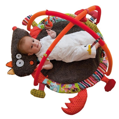 This full-featured play gym can be used by babies lying on their backs or enjoying tummy time. The toys -- squeaking phone, chirping chicken, rattling pig and Red Riding Hood with a removable coat -- can be hung from above or attached to the mat.