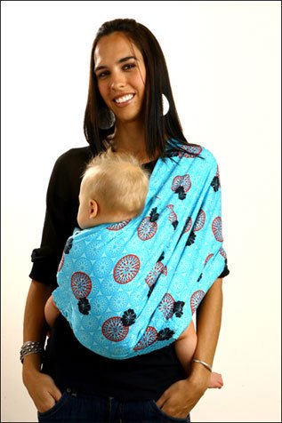 Organic Adjustable Pouch by Rockin' Baby in 'Perfect Day' features three yards of cheery light turquoise blue fabric with a geometric inspired medallion print, contrasting medallions and black hibiscus flowers. This Cotton Rockin' Baby Pouch reverses to a solid light blue turquoise, essentially giving you two pouches for the price of one. Rockin' Baby Pouches are easily adjusted with 4 zippered settings and can be worn in 5 different carrying positions. The inside rail of the pouch is lightly padded for your little one's comfort and the zipper cover can also be used to add extra padding for your comfort or a handy place to store an extra diaper. Sizing Information: Small-Medium. Small to average size, to tall and slim, to petite but voluptuous - the Small-Medium fits a wide range of body types and sizes (ideal for couples) Height: 5'3" to 6'4". Bust: 32A to 36B for 5'3" to 6'4" -- 32A to 38DD for 5'3" to 5'7". Shoulder to Hip: 22" to 30". Weight: 110 lbs to 200lbs